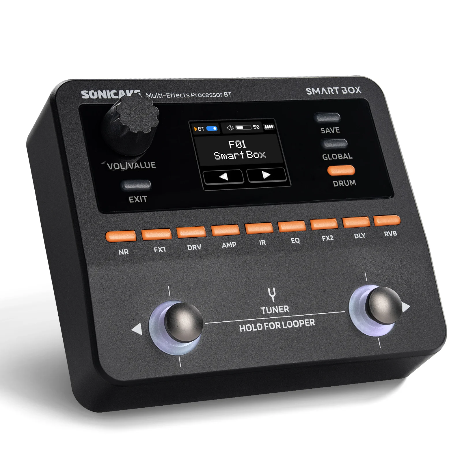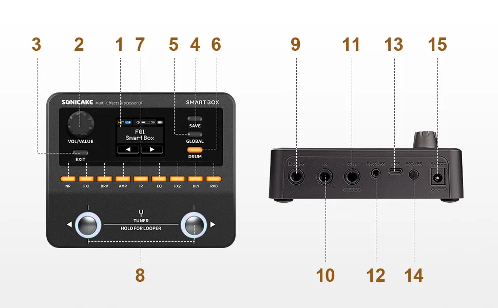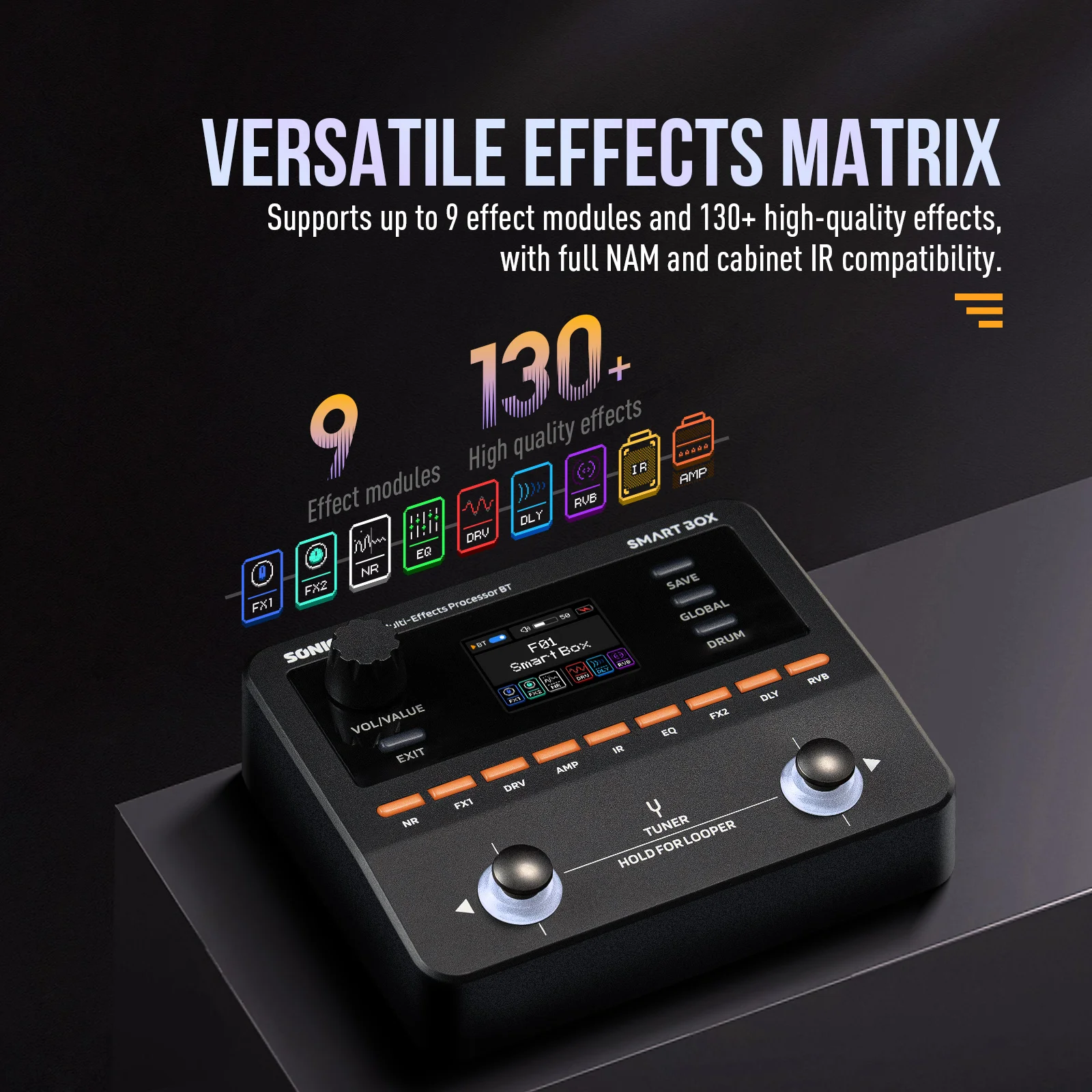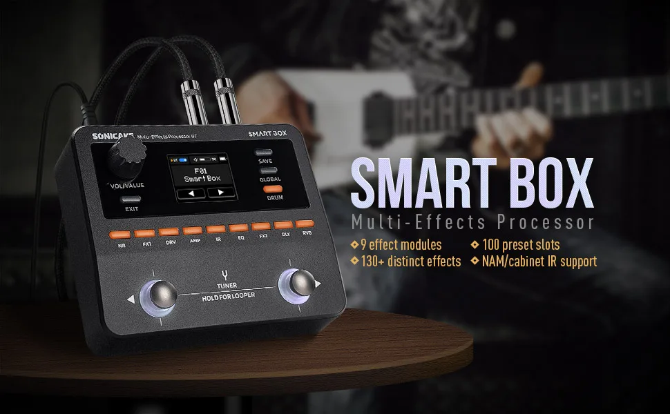 O Smart Box da Sonicake redefine a modelagem de timbres portáteis com tecnologia proprietária de modelagem digital white-box. Ele reúne mais de 130 efeitos premium de amplificadores e pedais, além de suporte total para NAM e IR de gabinetes — oferecendo possibilidades sonoras ilimitadas em uma unidade compacta.